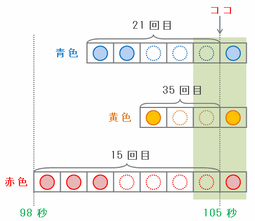 ・赤色→105÷7=15なので、「3秒光って4秒消える」の15回目がちょうど終わる。