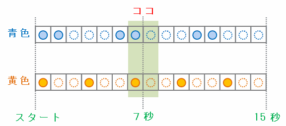 青色の電球の周期は「2秒光って3秒消える」の5秒、黄色の電球の周期は「1秒光って2秒消える」の3秒なので、5秒と3秒の最小公倍数である15秒間の様子を図に表してみると次のようになります。