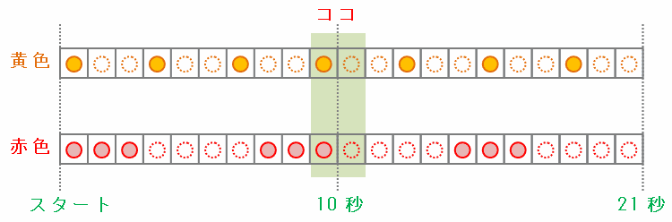 ・黄色と赤色の電球→10秒後、31秒後、52秒後、73秒後、・・・