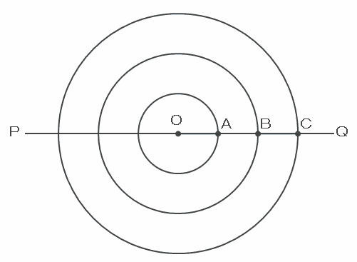 次の図のように、点Oが中心で、半径がそれぞれ1㎝、2㎝、3㎝の3つの円と、Oを通る直線PQがあります。点A、B、Cが図の位置からそれぞれ3つの円周上を同じ方向に同じ速さで動きます。Aが4秒で1周するとき、次の問いに答えなさい。