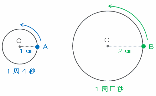 3つの点はそれぞれのコースを同じ速さで進むので、円周の長さが2倍、3倍になれば、1周するのにかかる時間もそれに比例して2倍、3倍と増えていきます。