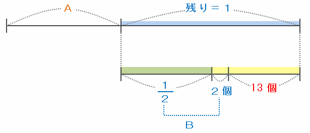 つまり、次の図の緑色の部分が残りの2分の1なら、黄色い部分も残りの1-2分の1=2分の1にあたるので、残りの2分の1は2+13=15個であることが分かります。