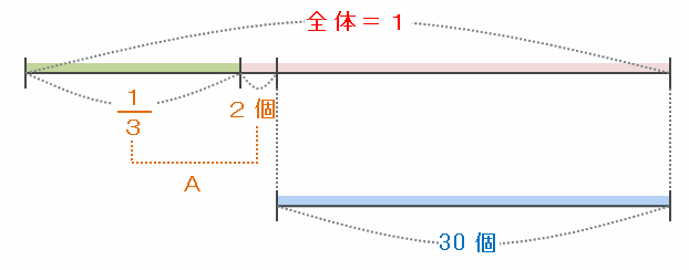 次の図のように、あめ玉全体の個数を1とおくと、Aさんはその3分の1と2個を取ったので、残りは30個になりました。