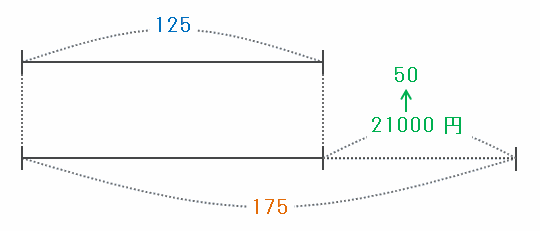 つまり、値下げ後の売り上げ高は「125」と「175-21000円」という2通りの表し方があるので、それを次のような線分図に表して比べてみると、175-125=50が21000円にあたることが分かります。