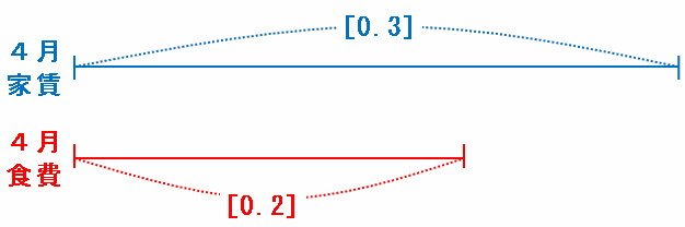 [1]とおくと、次の線分図のように4月の家賃は[0.3]、4月の食費は[0.2]と表せます。