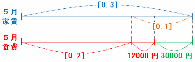 このとき、上の図の[0.3]-[0.2]=[0.1]が12000+30000=42000円にあたるのですが、4月の食費の割合は[0.2]なので、42000×2=84000円になります。