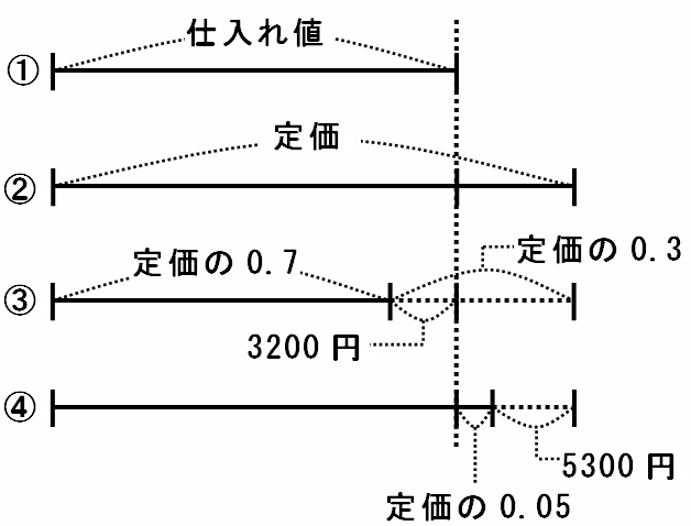 線分図③と④を比べると、定価の0.3=3200円+定価の0.05+5300円であることが分かります。