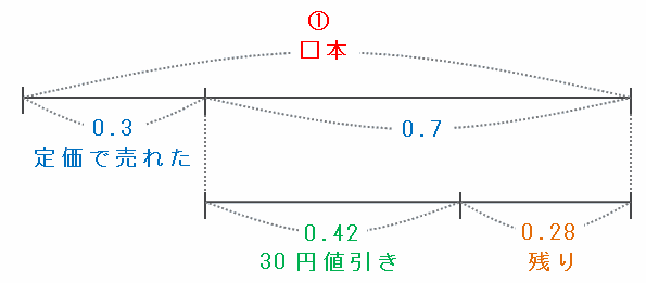 ・定価の30%引きで売れたバラ→残りの6割=(1-0.3)×0.6=0.42