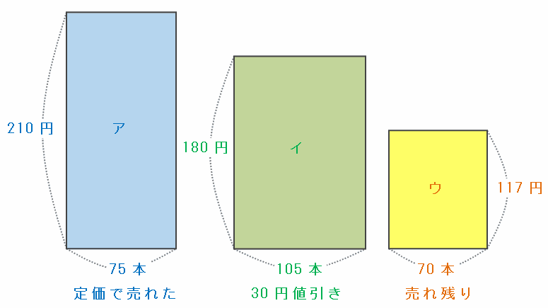 上の図の75+105=180本を、値引きせずにすべて定価1.75で売った場合、売り上げの合計(図のア+イ+エ)は1.75×180=315と表せます。