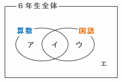 さっきのベン図の「アイウエ」から「アイウ」を引くと、どちらの教科も平均点より低かったエの人数が求められます。