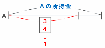 たとえば次の図のように、Aの最初の所持金の4分の3がチケット代である1にあたるので、Aの最初の所持金は1÷(4分の3)=3分の4と表せます。