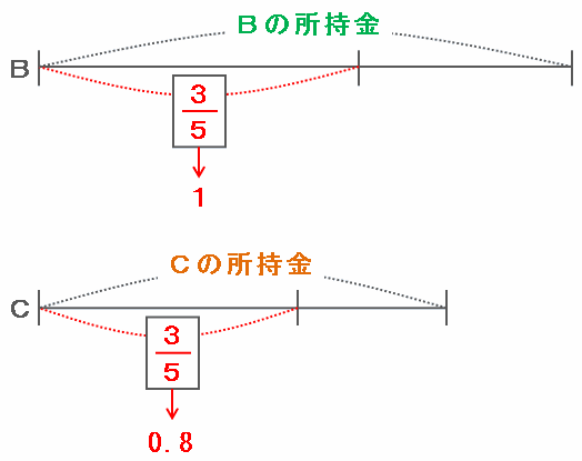 次の図を使って同じようにBとCの最初の所持金の割合を求めてみると・・・
