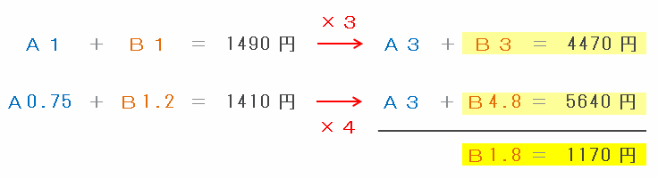 ・「A×1+B×1=1490円」を3倍→A×3+B×3=4470円