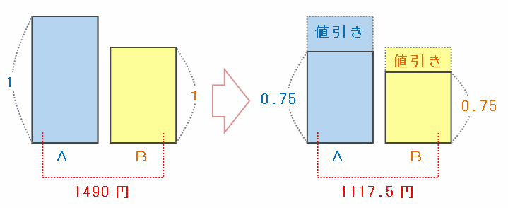 品物AとBをどちらも定価で買ったときの合計は1490円ですが、もし次の図のように、AだけでなくBも2割5分引きだった場合の合計は、