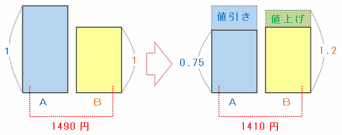 実際には、品物Aは上の図のように2割5分引きでしたが、Bは定価の2割増しだったので、次の図のように合計は1410円になりました。