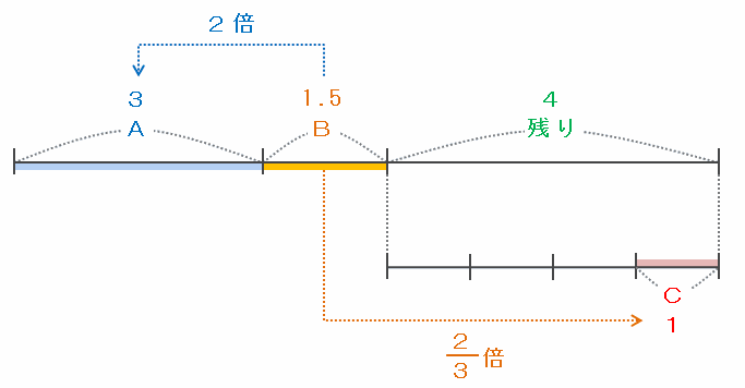次の図のように、Cがとったピザの量はBの3分の2にあたるので、Cがとったピザの量を1とおくと、Bがとったピザの量は1÷(3分の2)=2分の3=1.5と表せます。