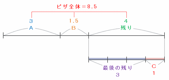 つまり次の図のように、ピザ全体の量は3+1.5+4=8.5、そしてCがとった後に残ったピザの割合は4-1=3なので、最後に残ったピザの割合は、全体の3÷8.5=17分の6になります。