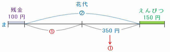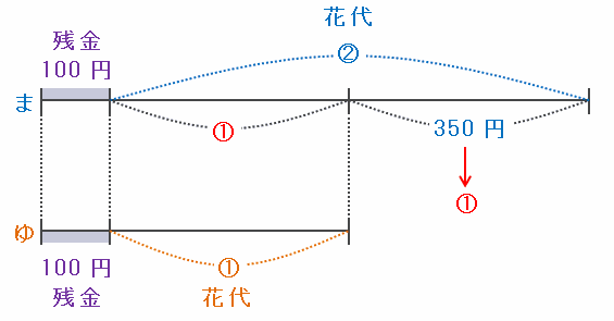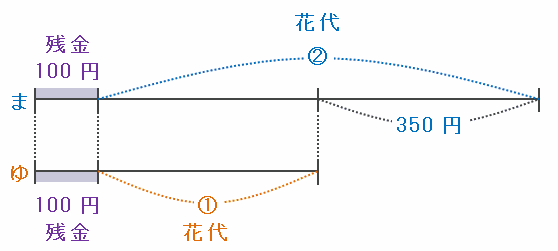 文房具店でまゆみさんが払った金額は30×5=150円、ゆかさんが払った金額は50×2=100円なので、次の図のように、2人の所持金の差は150-100=50円縮まり、400-50=350円になります。