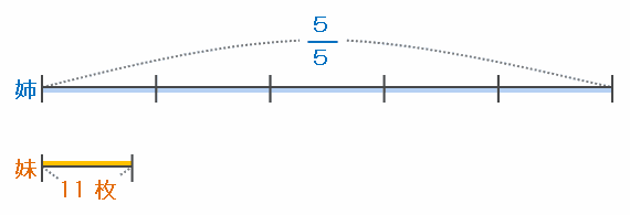 姉が最初に持っていたカードの枚数を1=5分の5とおいて、2人のカードの枚数の関係を次のような線分図に表してみます。