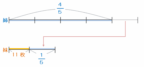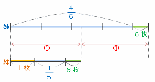 次の図のように、姉は自分が持っていたカードの5分の1を妹にあげたので、この時点で2人のカードの枚数は、