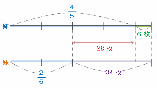 それが最後の姉のカードの枚数である「5分の4+6枚」と同じなので、次のように長さの等しい2本の線分図に表して比べてみると、下の図の34-6=28枚が、5分の4-5分の2=5分の2にあたることが分かります。