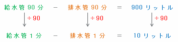 その様子を式に表すと、次の図のように「給水管90分-排水管90分=900リットル」となり、さらにその式全体を90で割ると「給水管1分-排水管1分=10リットル」と表せます。