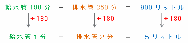 排水管2本を180分使うのは、排水管1本を180×2=360分間使うことと同じなので、次の図のように「給水管180分-排水管360分=900リットル」という式が作れ、さらにその式全体を180で割ると「給水管1分-排水管2分=5リットル」となります。