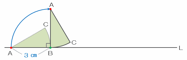 おうぎ形ABCが点Bを中心として、次の図のように辺ABが直線Lに対して垂直になるまで回転するとき、おうぎ形の頂点Aは図の青い矢印のように動きます。
