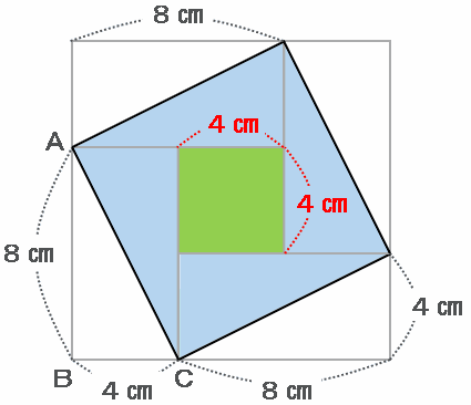 以上から、辺ACを一辺とする正方形の面積は64+16=80㎠になります。