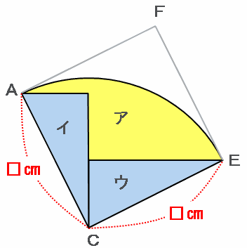 下の図のおうぎ形ACEの面積から直角三角形イとウの面積を引けば、アの面積だけが残ります。