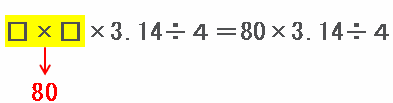 また、辺ACと辺CEの長さを□㎝とおくと、おうぎ形ACEの面積を求める式は□×□×3.14÷4と表せます。