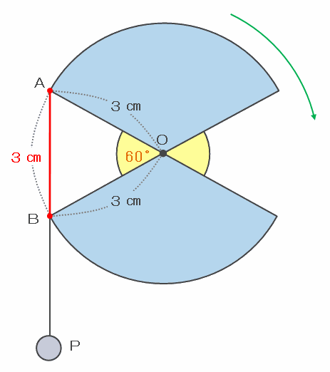 この三角形は、角AOBが60度で辺OAとOBがどちらも3㎝なので正三角形であり、辺ABの長さも3㎝になります。