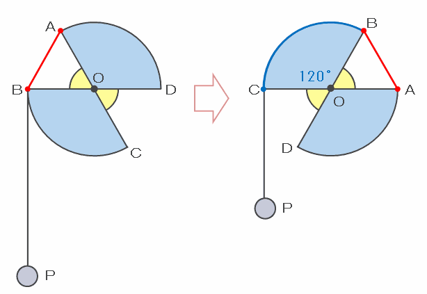 次の図のように、板Xを時計回りに少しだけ(正確には30度)回転させると、糸の端が点Bにくっついて三角形OABができます。