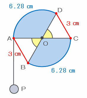 そのときの青い曲線の長さは、半径3㎝で中心角120度のおうぎ形OBCの弧の長さを計算すれば求められるので、3×2×3.14×360分の120=6.28㎝になります。