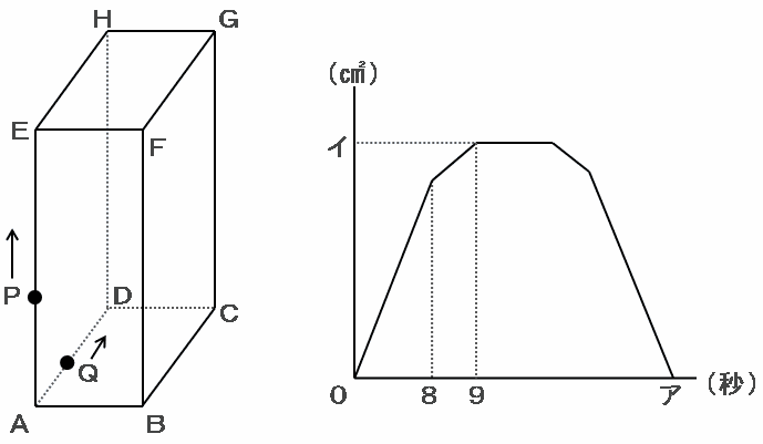グラフのアは、秒速1㎝で進む点Qが辺ADから辺DC、そして辺CBを進むのにかかった時間を表しています。