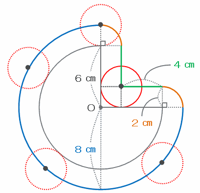 半径2㎝の円が、次の図のように半径6㎝で中心角270度のおうぎ形のまわりを転がりながら1周するとき、円と接する部分は、
