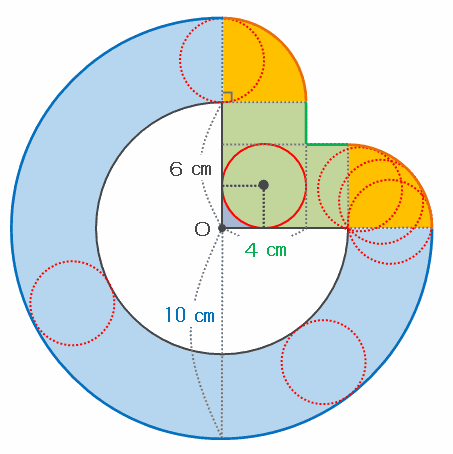 おうぎ形のまわりを、次の図のように半径2㎝の円が通過した部分の面積は、図の「青い食べかけのドーナツ」と「オレンジ色のおうぎ形2個」と「緑色のL字型の図形」の面積の合計から、中心Oの近くにある「小さな紫色の部分」の面積を引けば求められます。