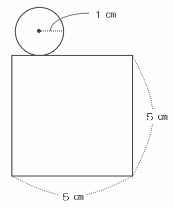 次の図のように、1辺が5㎝の正方形の周りに半径1㎝の円を、もとの位置に戻るまで転がしたとき、円が通った部分の面積は何㎠ですか。ただし、円周率は3.14とします。