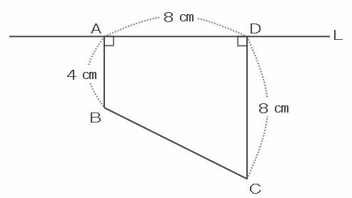 次の図のように、辺ABを真下に4㎝延長したところを点Eとして、ついでに点EとCを直線で結ぶと、AECDは台形ABCDを包み込むような1辺8㎝の正方形になります。