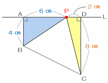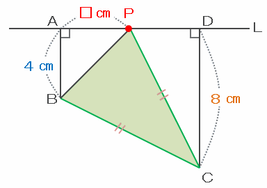 上の図の辺ADは8㎝、そして辺PDは4㎝なので、この問題で求めたい辺APの長さの1つ目は8-4=4㎝になります。