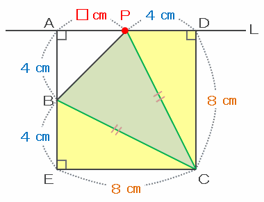 また、この図の直角三角形BECとPDCは、辺BCとPCの長さが等しく、辺ECとDCの長さもともに8㎝なので合同(直角三角形は、斜辺とほかのもう1組の辺の長さが等しければ合同)であり、辺PDの長さはBEと同じく4㎝になります。