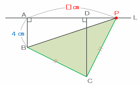 次の図のように、点Pが点Dよりも何㎝か右にあるときも、三角形PBCは辺BCとPCの長さが等しい二等辺三角形になります。