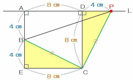次の図のように補助線を引いて、さっきと同じく台形ABCDを包み込むような1辺8㎝の正方形AECDを完成させると、直角三角形BECとPDCは、辺BCとPCの長さが等しく、辺ECとDCの長さがともに8㎝なので合同になります。