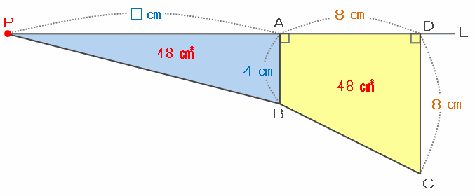 つまり、下の図の辺PAの長さは48×2÷4=24㎝なので、辺PDの長さは24+8=32㎝になります。