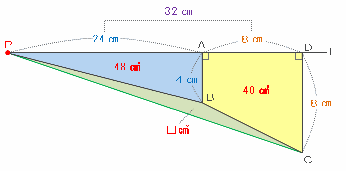 次の図の三角形PDCの面積は32×8÷2=128㎠、そして三角形PABと台形ABCDの面積の合計は48×2=96㎠です。