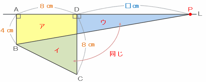 また、下の図の台形ABCDの面積は「ア+イ」、三角形PABの面積は「ア+ウ」であり、その2つの面積がどちらも48㎠で等しいので、イとウの面積は同じであることも分かります。