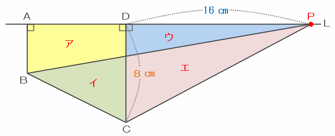 ウとエを合わせると、ちょうど直角三角形PCDになるので、答えの2つ目は16×8÷2=64㎠になります。