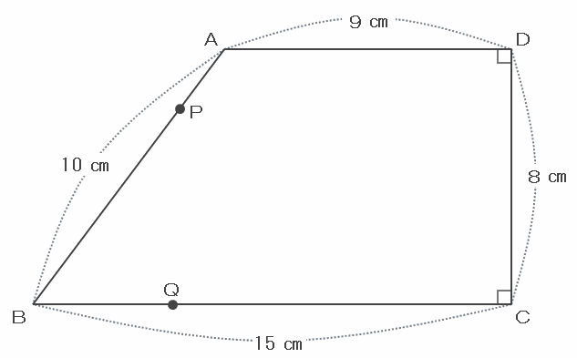 スタートしてから4秒後の点PとQの位置を次の図のように書き込み、ついでに点AとQを直線で結んでみると、辺BCは15㎝、辺BQは6㎝なので、辺QCの長さは15-6=9㎝になります。