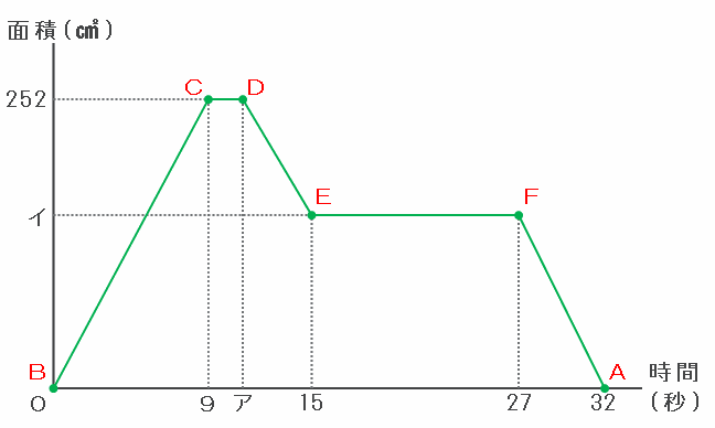 上のグラフから、点PはBC間を9秒、CDとDE間を合わせて15-9=6秒、EF間を27-15=12秒、FA間を32-27=5秒かけて進むことが分かります。