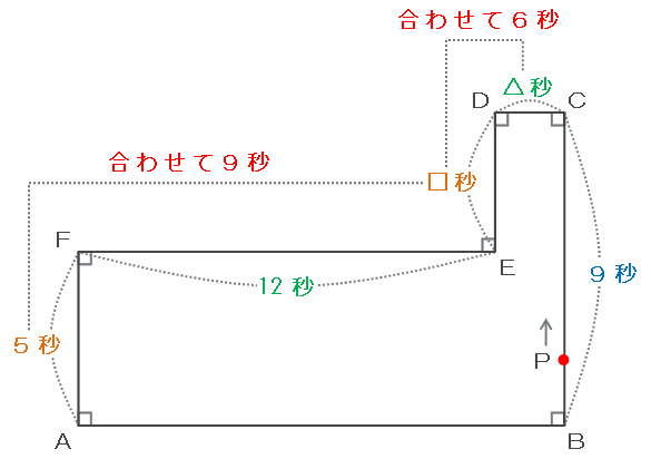 また、次の図の辺DEとFAの長さの合計は辺BCの長さと等しいので、点Pが辺DEとFAを進むのにかかる時間の合計は、辺BCを進むのにかかる時間と同じく9秒です。
